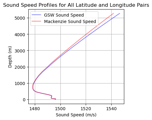 The difference between TEOS‑10 and Mackenzie sound speed in the figure above illustrates sensitivity of accurate SSPs. Near the surface, where temperatures are high and salinities are relatively low, the Mackenzie formula underestimates the sound speed by ~1–2 m s⁻¹ compared with TEOS‑10. At greater depths (>1 000 m) the divergence grows because the Mackenzie formula approximates pressure dependence by depth, whereas TEOS‑10 uses pressure and absolute salinity; differences of 3–4 m s⁻¹ emerge.
